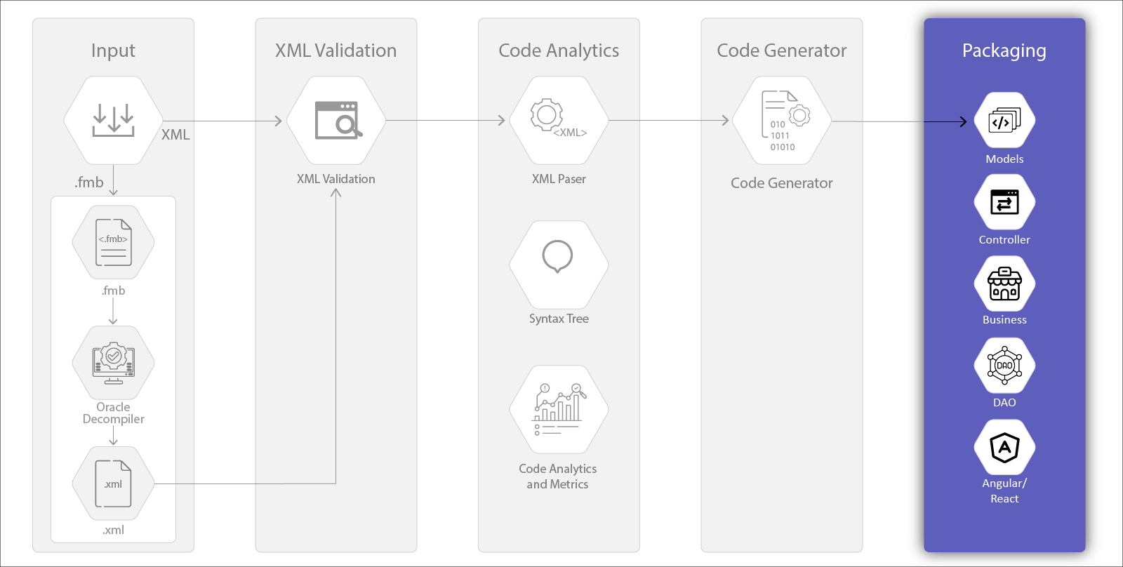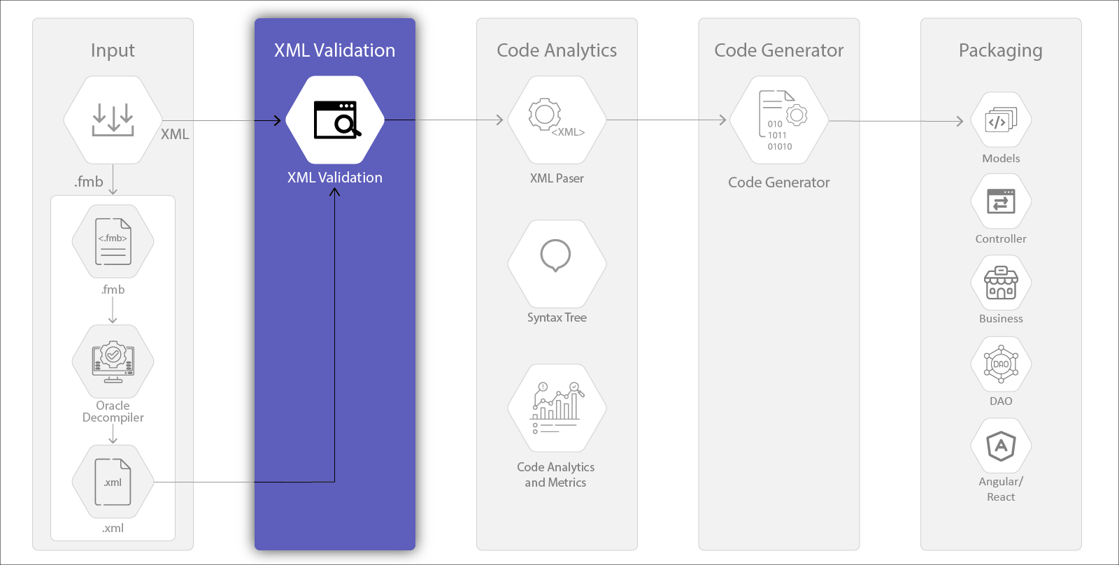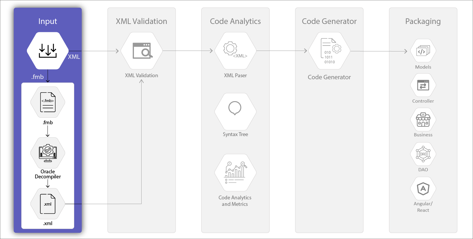Vrnda feels proud of its talented resources. Their deep acumen and analytical abilities have given rise to a tool that can modernize legacy systems instantly to an accuracy of the standards, which are much above the industry standards. The process gets completed in five stages: Input, XML Validation, Code Analytics, Code Generator, and Output. The tool adds much value to the process and completes many complex tasks quickly, which otherwise need many working hours. Vrnda Modernizer is a game changer.